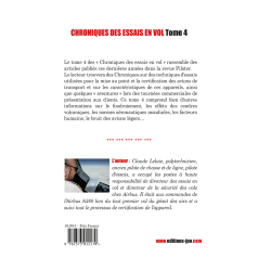Le tome 4 des « Chroniques des essais en vol » rassemble des articles publiés ces dernières années dans la revue Piloter. Le lecteur trouvera des Chroniques sur des techniques d’essais utilisées pour la mise au point et la certification des avions de transport et sur les caractéristiques de ces appareils, ainsi que quelques « aventures » lors des tournées commerciales de présentation aux clients. Ce tome 4 comprend bien d’autres informations sur le foudroiement, les effets des cendres volcaniques, les normes aéronautiques mondiales, les facteurs humains, le bruit des avions légers...